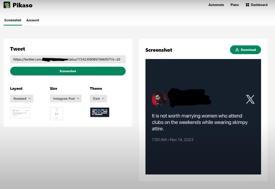 Conversion for posting on IG: Now, Since you have already posted on twitter. What I need you to do is, copy the link of this tweet and go to pikaso. This is a tool that turns your simple twitter posts into fancy looking ones. This Tool is Not a Free One You need to Pay $8/m or ₹600/ m for it. But What you Need to Understand is That We Are Talking About Thousands of Dollars/Lakhs in Rupees Here this much Initial Investment Is Necessary, If you Are Too Frugal Business is Not For You. I know you can Create The Same Post On Pixel Lab or Photoshop But You will Need to Spend a Lot Of Time, The Value of Time is Insane In Business so That Is Not Recommended. You Need to Trust Me and Invest Anywhere I tell you to and Not think Twice, I Won’t Advise You The Wrong Thing to Do. Now Paste the link you copied. And Do The Settings As The Following Screenshot.